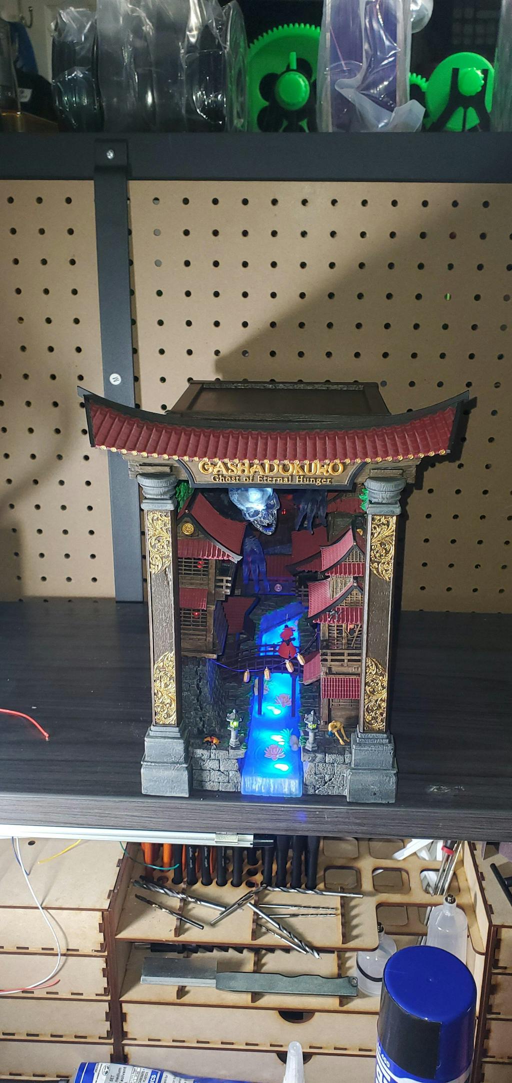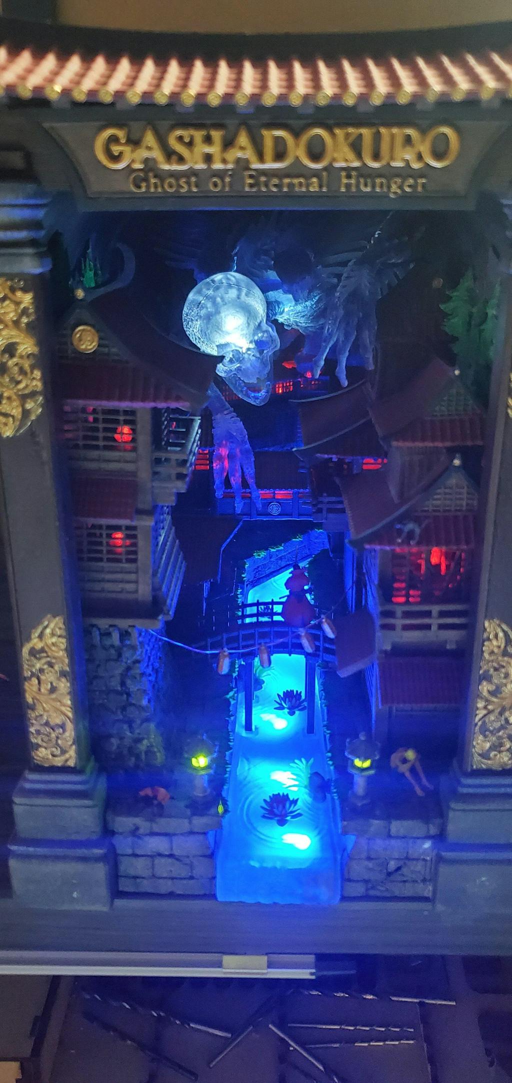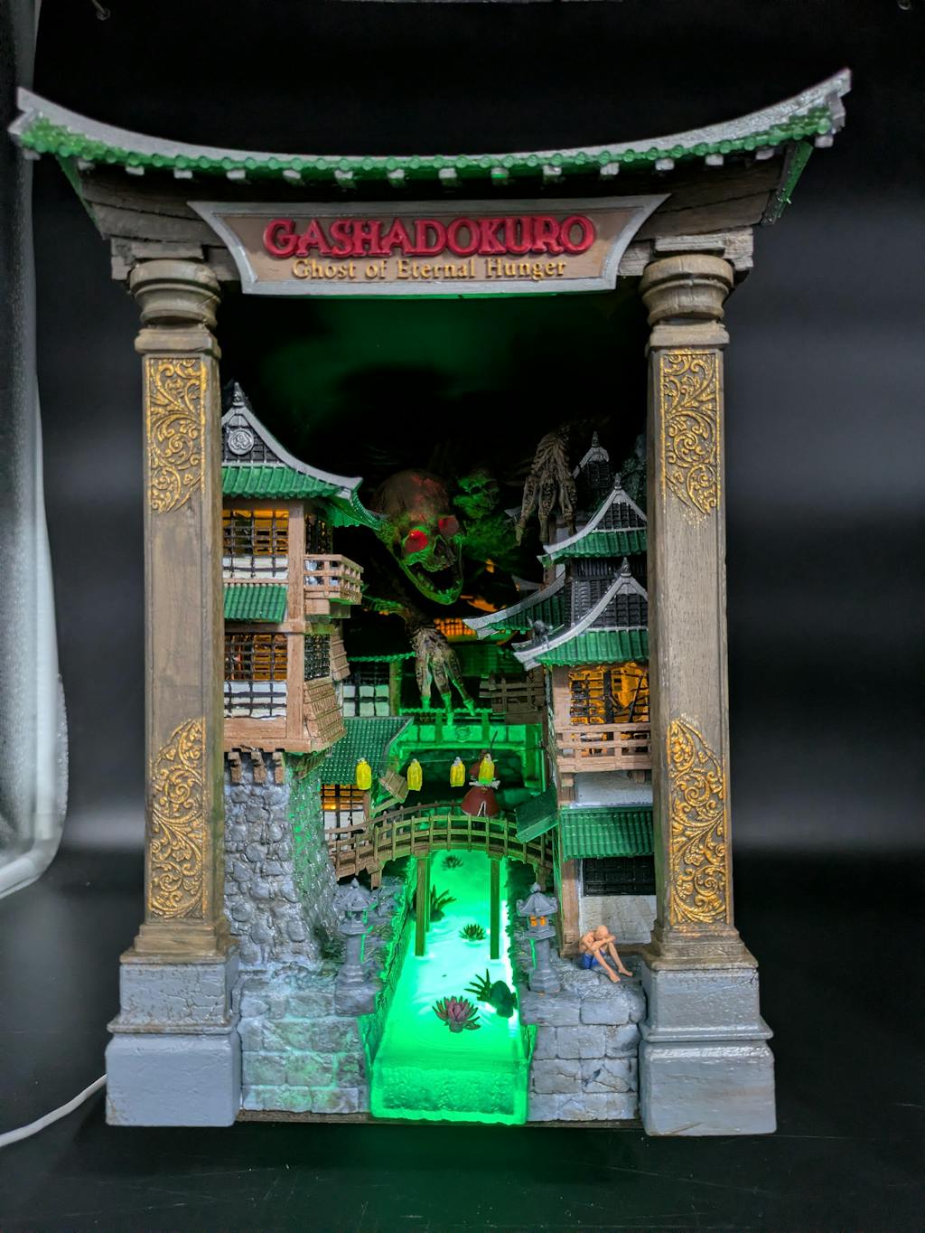 Step into a haunting Japanese alleyway where the past and the supernatural collide in this stunning Halloween-themed book nook. The scene is dominated by the menacing Gashadokuro, a giant skeletal creature born from the starved, as it crashes through buildings, reaching out toward our hero, Himiko, a fearless samurai woman. The tension of their inevitable confrontation fills the air.