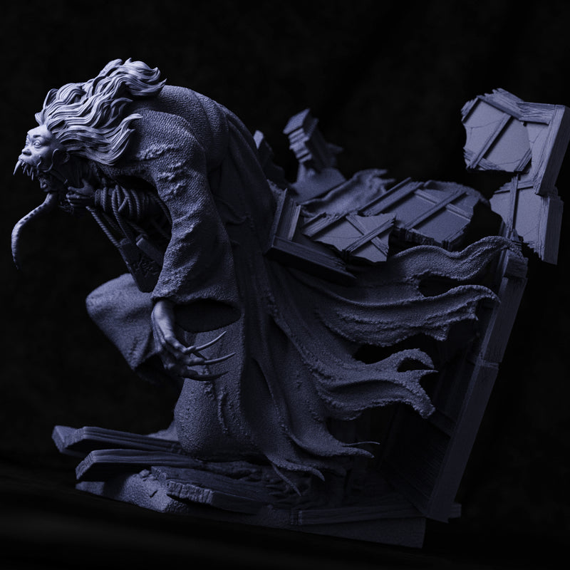 The main bailey stood eerily empty and dark. No guards flanked the heavy wooden doors to the keep. No servants hurried about their duties. Wrong. Something was very wrong. A wet gurgle leaked through Tamiya's door. "My lord!" Akio called, breaking into a run. His armor clattered with each step. "Tamiya-sama! Tamiya-sama!" He reached the entrance, heart pounding against his ribs. A sound came from within—movement, Lord Tamiya's voice, something scraping against wood. Relief loosened the knot in his chest. They were alive. He pushed the door open. "Apologies my lord, I—" Pain erupted in his right shoulder—sharp, sudden, tearing through muscle and bone from above. Akio staggered, looking down at the object protruding from his body. Not an arrow. Longer. Jagged. Like a— Like a bone. A wet, gurgling sound came from somewhere above him. Akio raised his eyes to the ceiling. The thing clinging there wasn't Lady Oiwa. Not anymore. Before he could scream, the bone slashed down— faster than his eyes could track. No pain this time. Just a curious lightness, a sudden shift in balance. Akio watched his right shoulder collapse to the floor. He lost balance. As he hit the floor, darkness crowded the edges of his vision. Through the ragged tear in the door, he saw movement. Faces—or things that had once been faces—emerged from the shadows. Distorted. Hungry. Eyes that reflected no light. One of them wore Lord Tamiya's armor.