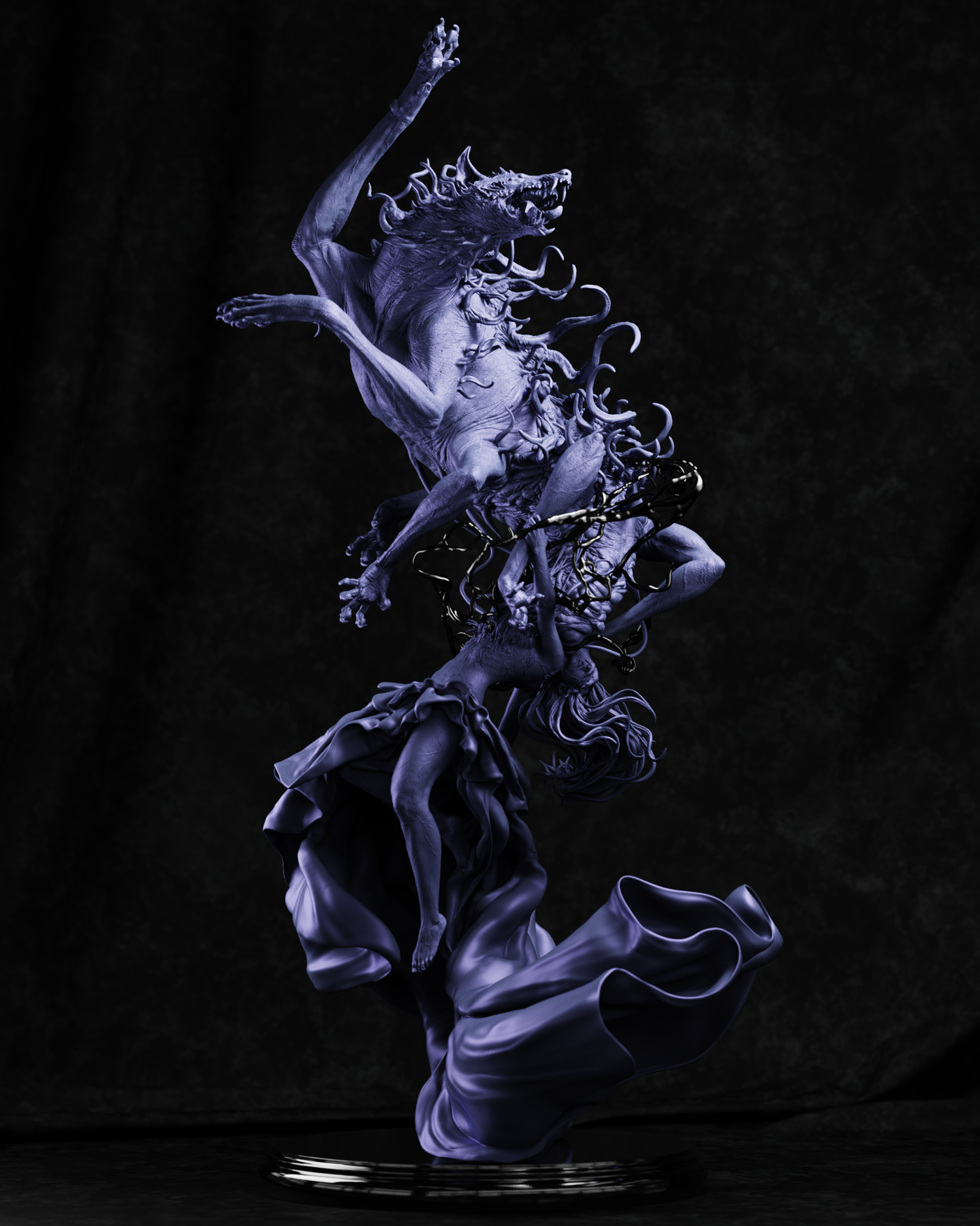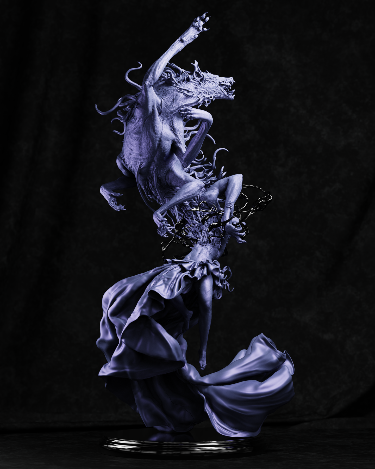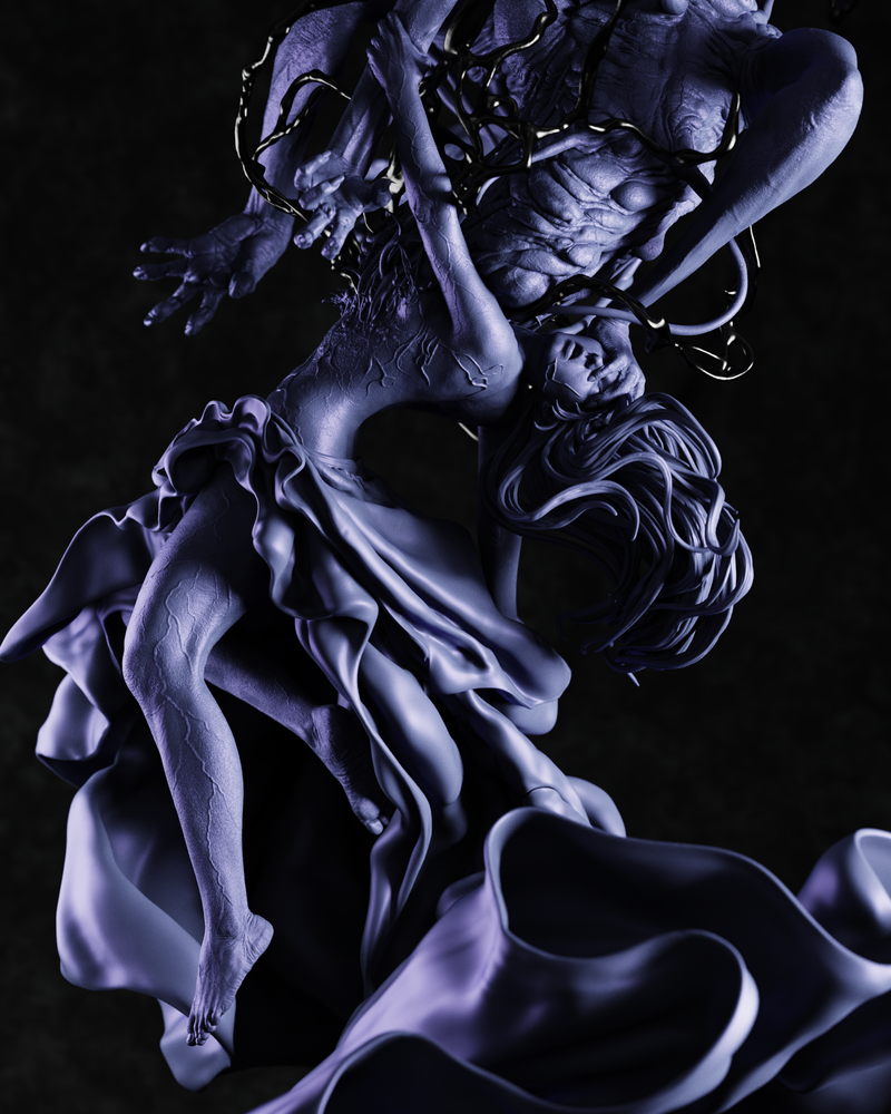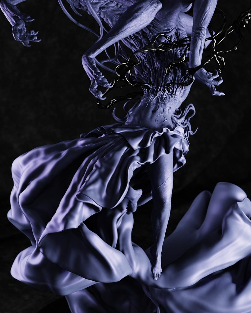 This dynamic sculpture is built on a mesmerizing, rotating spiral composition that captures a single, violent moment suspended in time. At its center, a woman floats in mid-air, anchored only by the elegant, sweeping folds of her dress. Bursting violently from her chest is a nightmarish, multi-armed, multi-eyed canine entity—a literal and terrifying manifestation of the inner demon. To complete this cinematic scene, droplets of splattered blood are frozen in the air around her, offering an incredible challenge and reward for miniature painters.